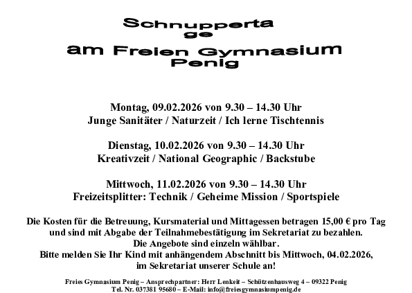 Danke für Ihr Interesse an einem Wechsel auf das Freie Gymnasium Penig und das Vertrauen, das Sie damit der Arbeit unserer Schule entgegenbringen. Ein Schulwechsel bringt häufig eine wahre Flut an Formularen, Informationen,Terminen und Fragen mit sich. Um Ihnen in diesem komplexen Prozess Orientierung zu bieten, finden Sie auf dieser Seite Hilfestellungen, damit Sie sich auf die wesentlichen Dinge konzentrieren können. Sie können jederzeit Kontakt zu uns aufnehmen. Wir freuen uns, Sie kennenzulernen.